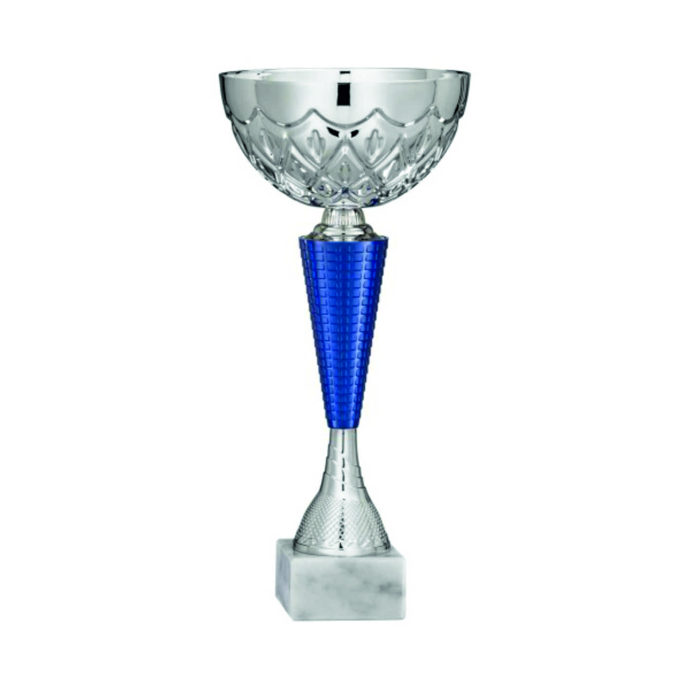 Coppa  trofeo in metallo color argento, corpo in plastica color argento/blu e base in marmo bianca. Questo prodotto può essere utilizzato per la premiazione di sport : calcio, ciclismo, nuoto, automobilismo, motociclismo, arti marziali, volley, basket ecc.. . Il prezzo è comprensivo di targhetta stampata in digitale UV