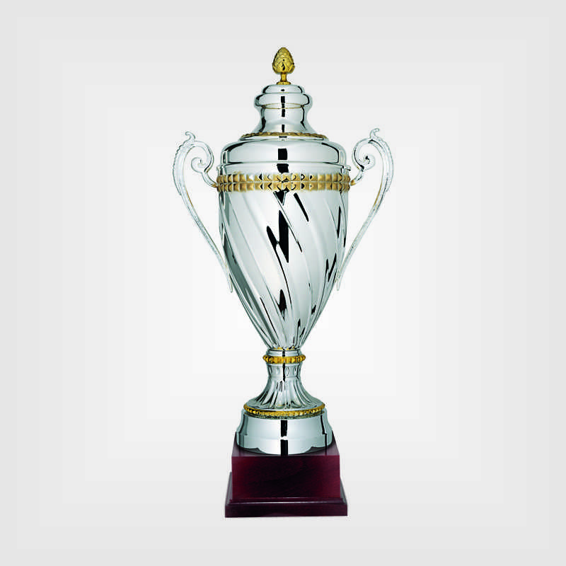 Coppa trofeo in ottone argentato e legno. Questo prodotto può essere utilizzato per la premiazione di vari sport come Pallavolo, Basket, Calcio, Tennis, , Ciclismo, ecc. Il prezzo è comprensivo di targhetta stampata in digitale UV